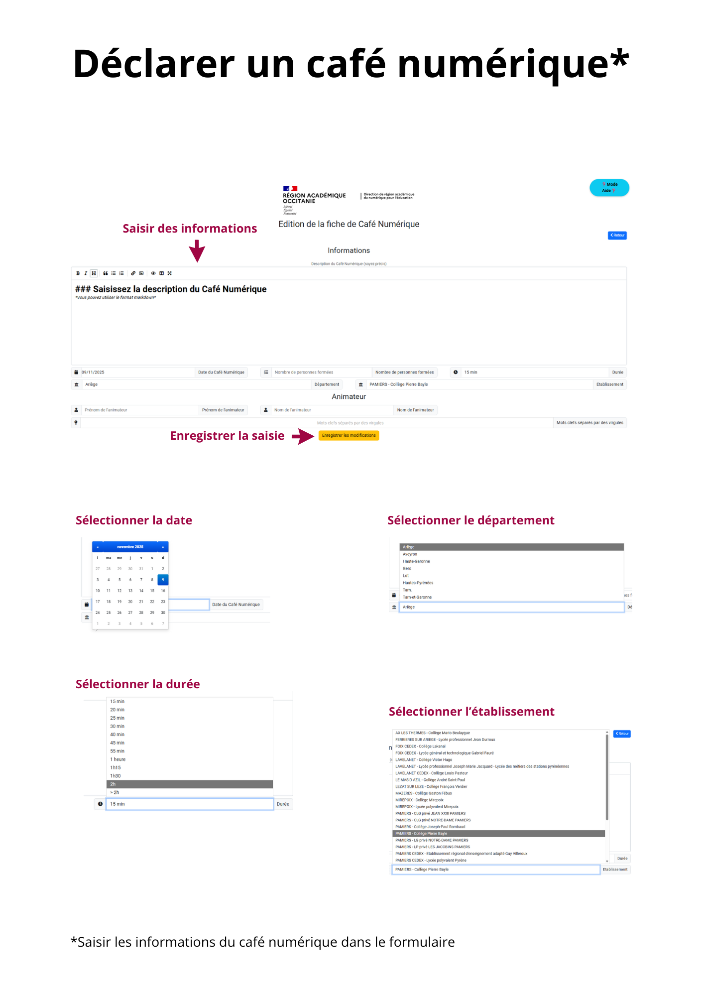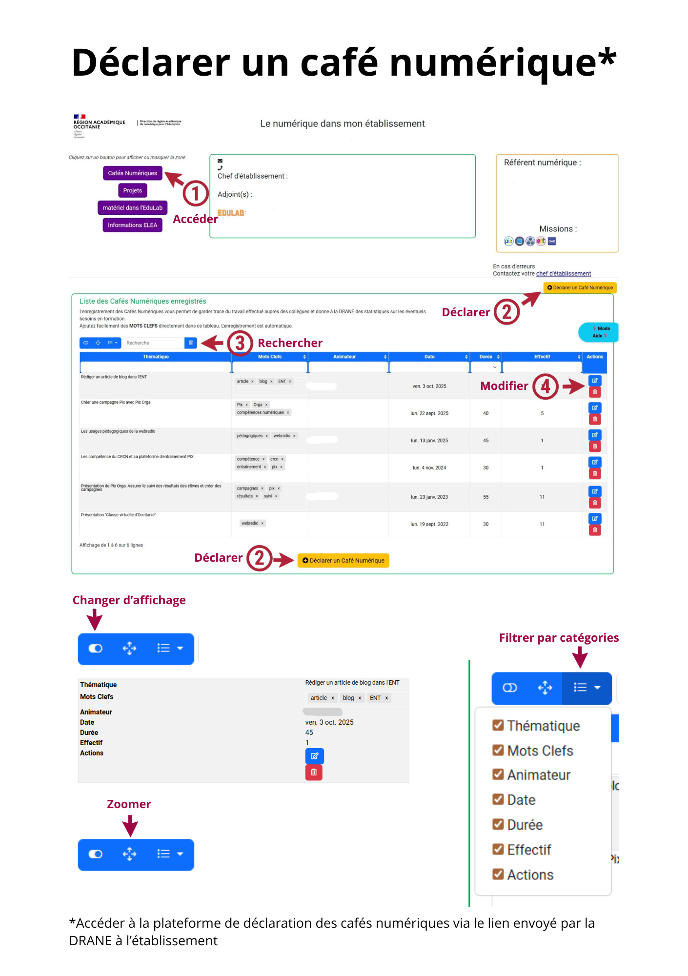 La déclaration d'un café numérique s'effectue en ligne, en accédant à une plateforme via un lien communiqué par la DRANE au chef d'établissement.